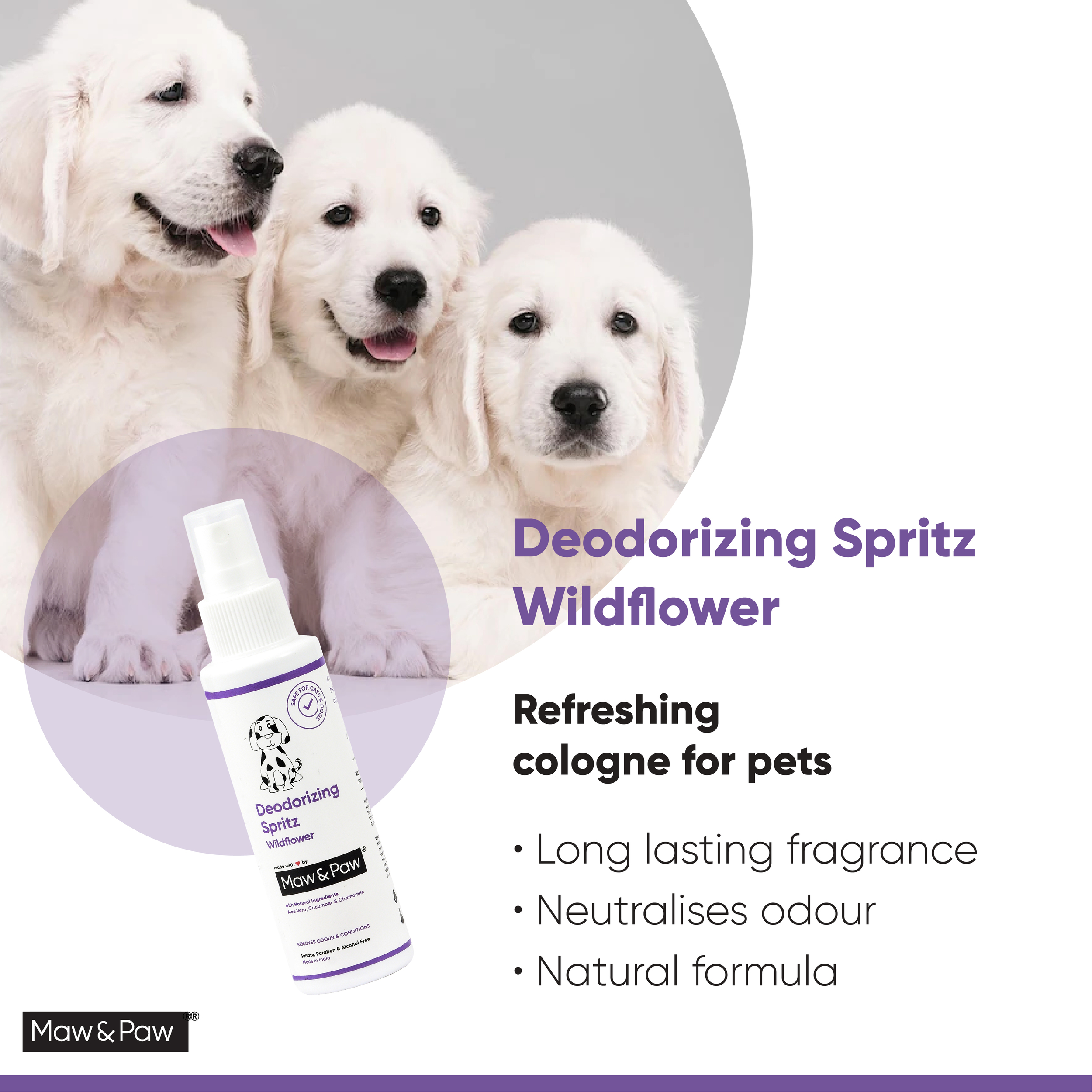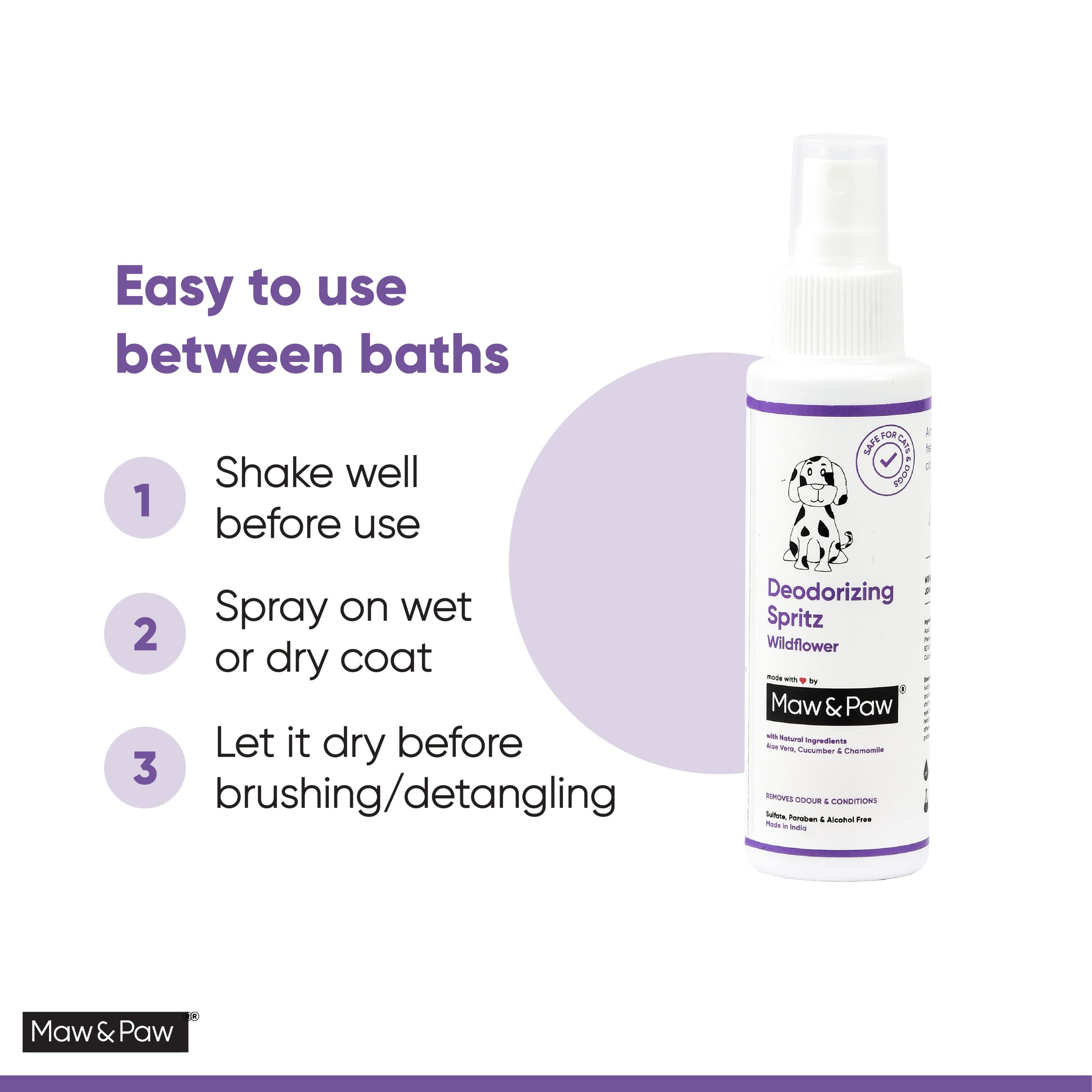 Love may be blind but it’s hard for even the fondest heart to ignore odours. Unfortunately, there are times when the apple of your eye doesn’t smell quite peachy. Pets could smell bad due to many factors like age & skin conditions. But don’t worry, our deodoriser spray is here to the rescue. It’s gentle enough for daily use and is allergen-free. So now your pet will smell great between baths as well.